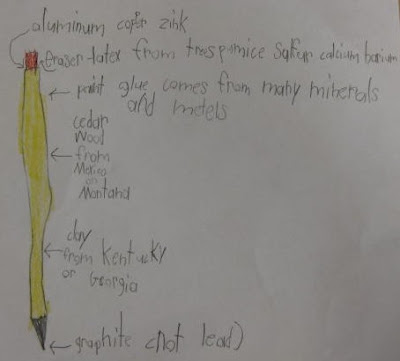In science today we learned where on our earth the natural resources needed to make a pencil come from. Did you know the wood comes from cedar trees in California? The graphite is mined in Mexico? The eraser comes from latex found in trees in South America? The aluminum from China?